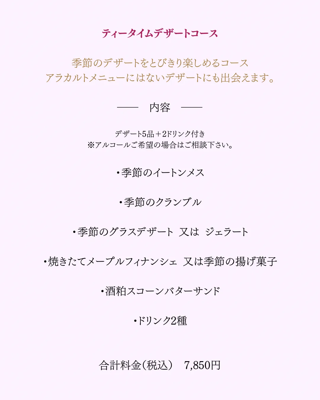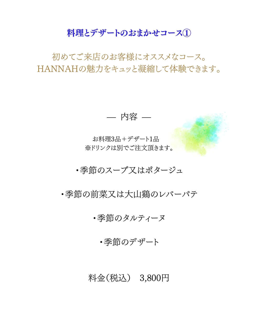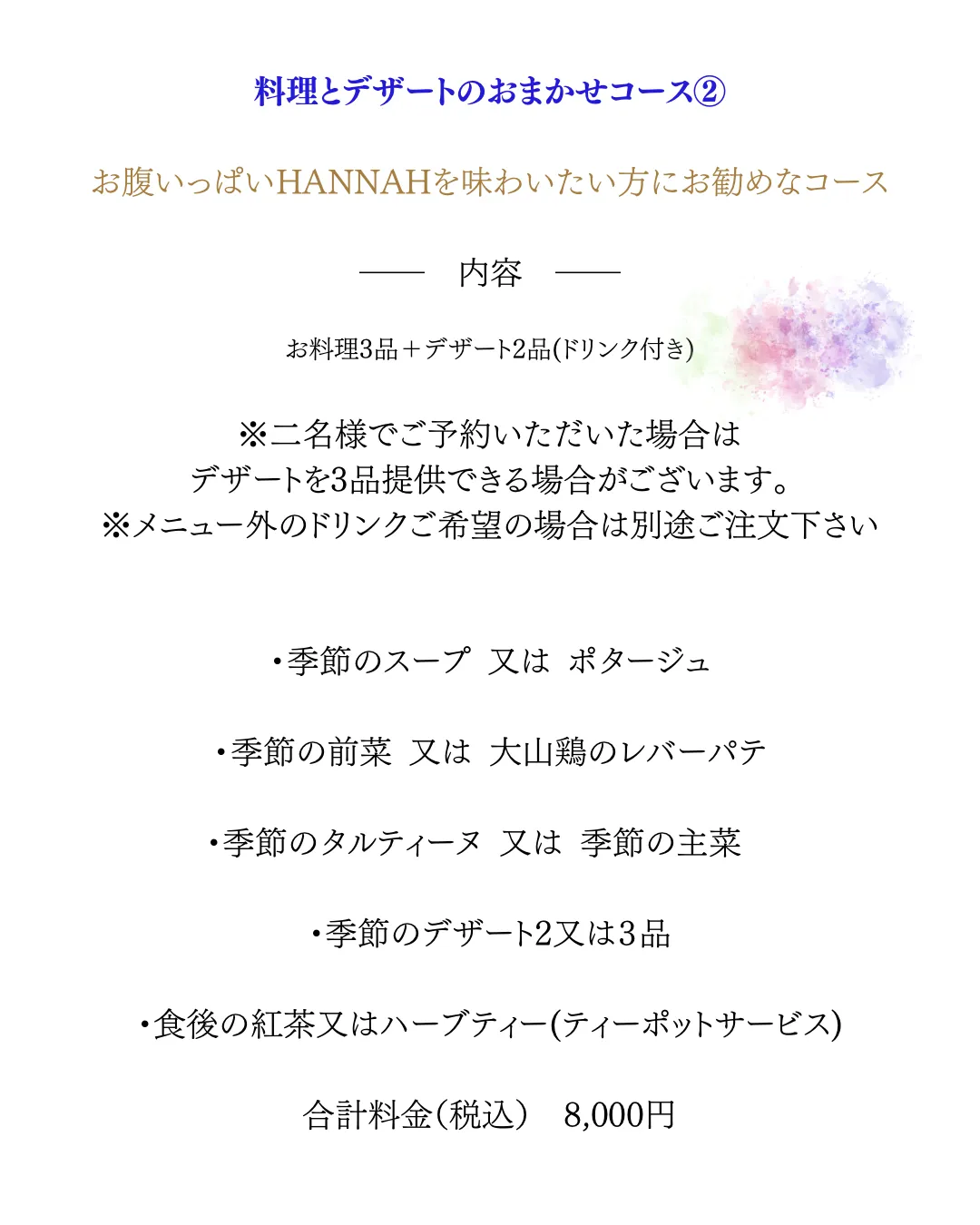 コース料理のご案内 2026/04/09 オンライン予約サイトはこちら↓ https://airrsv.net/handmadeshophannah/calendar ※前日や直前のお問い合わせはLINEからお願いします。 オンライン予約は2日前に締め切りとさせて頂いております。